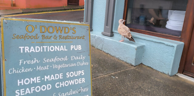 Es ist ja wirklich nicht kalt, es sind tags wie nachts 16°, aber es ist am Morgen schon grau. Es regnet auch nicht wirklich, es ist einfach sehr viel Feuchtigkeit in der Luft. Regnen soll es erst morgen und übermorgen richtig. Wir fahren los auf der N59 Richtung Galway und biegen dann rechts Richtung Cashel ab. Hier waren wir tatsächlich noch nicht. In der Bucht von Cashel gibt es einige sehr schöne und edel aussehende Häuser. Weiter geht es nach Roundstone wo wir im Panoramafenster sitzend auf den im grau versinkenden bunten Hafen schauen. Selbst die Möwen wollen lieber im Pub als draußen Grau in allen Schattierungen weiterlesen