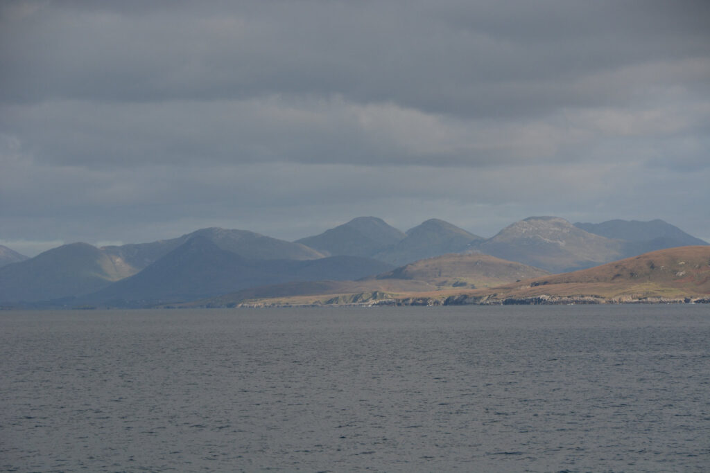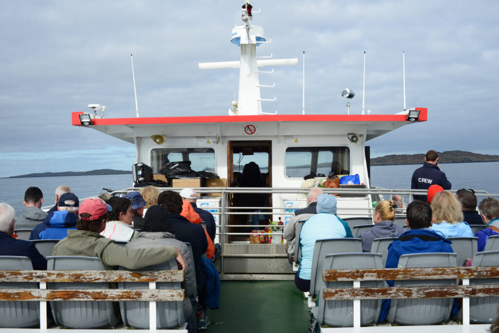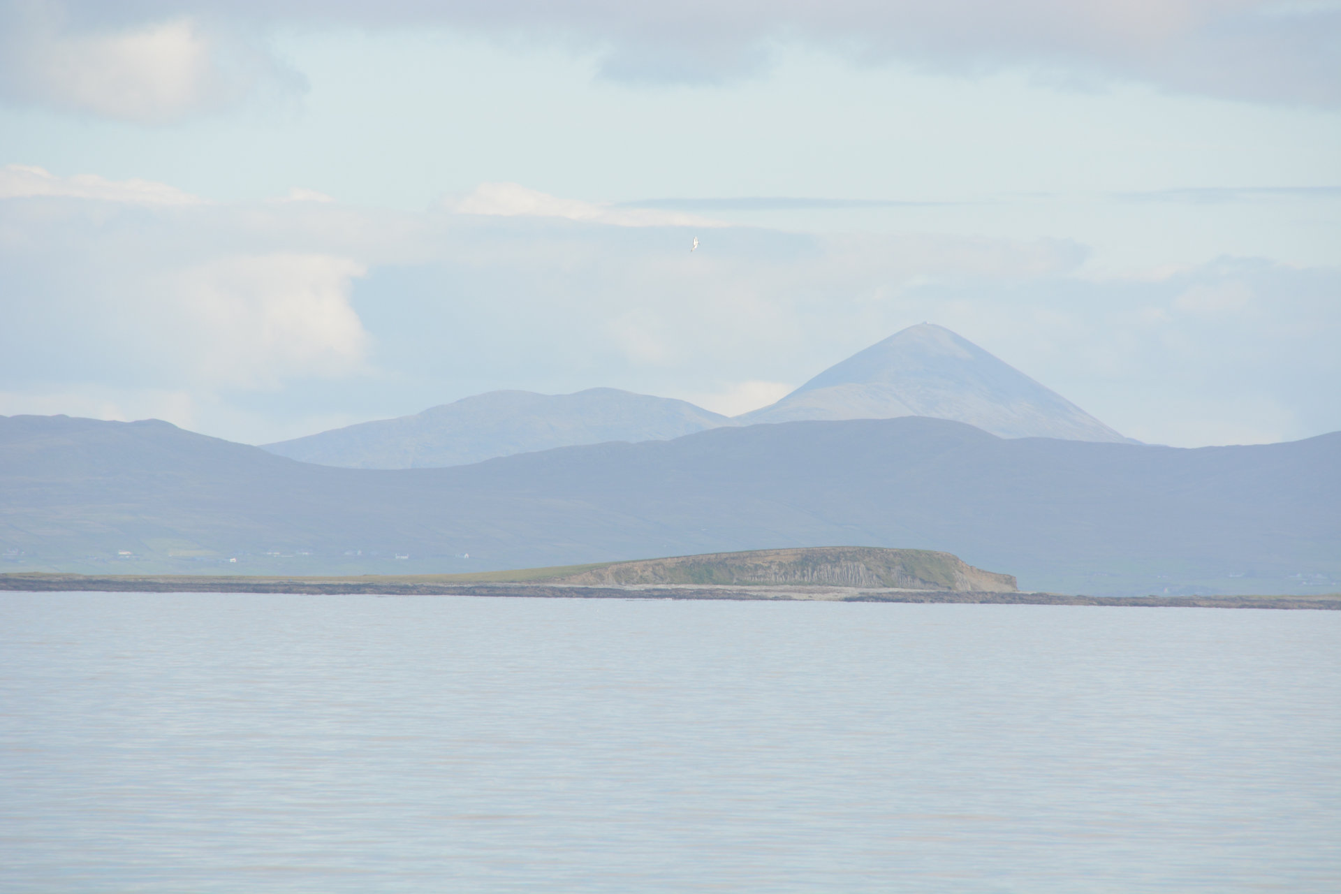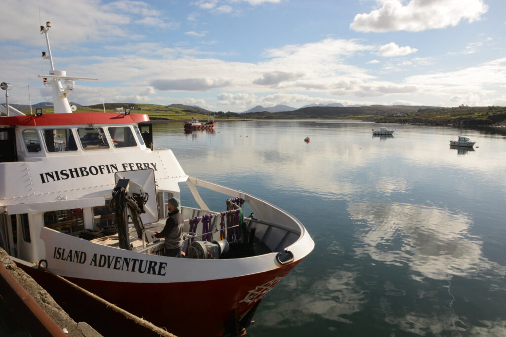 Die Überfahrt nach Inishbofin mit der Fähre dauert 35 Minuten und ist bei glattgebügeltem Meer ein Traum. Hinter uns sehen wir die Twelve Bens und Maumturk Mountains.