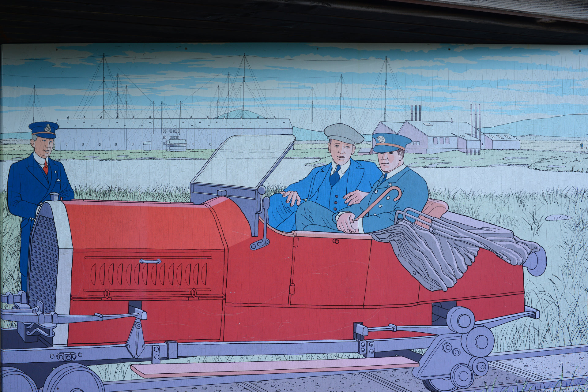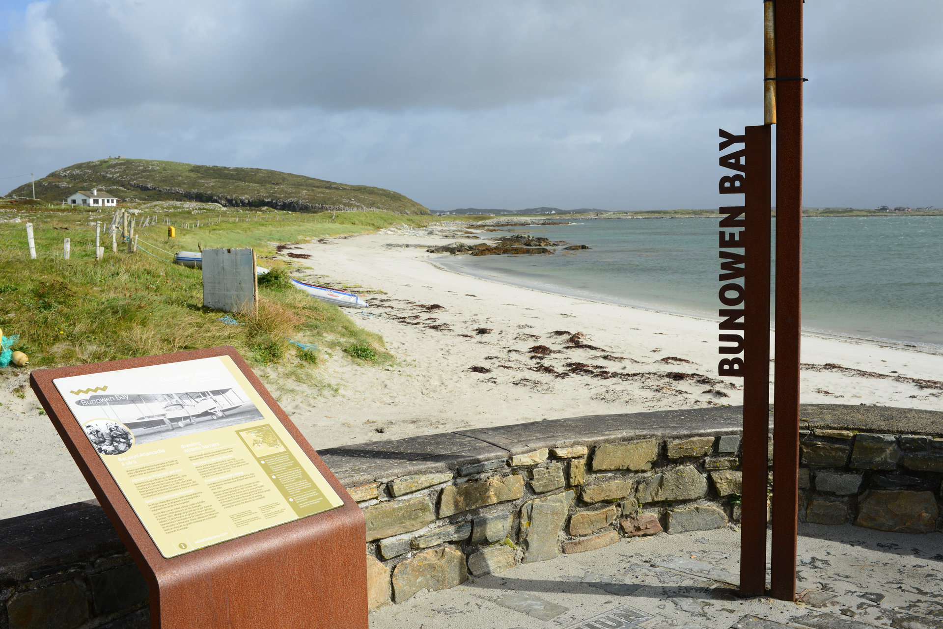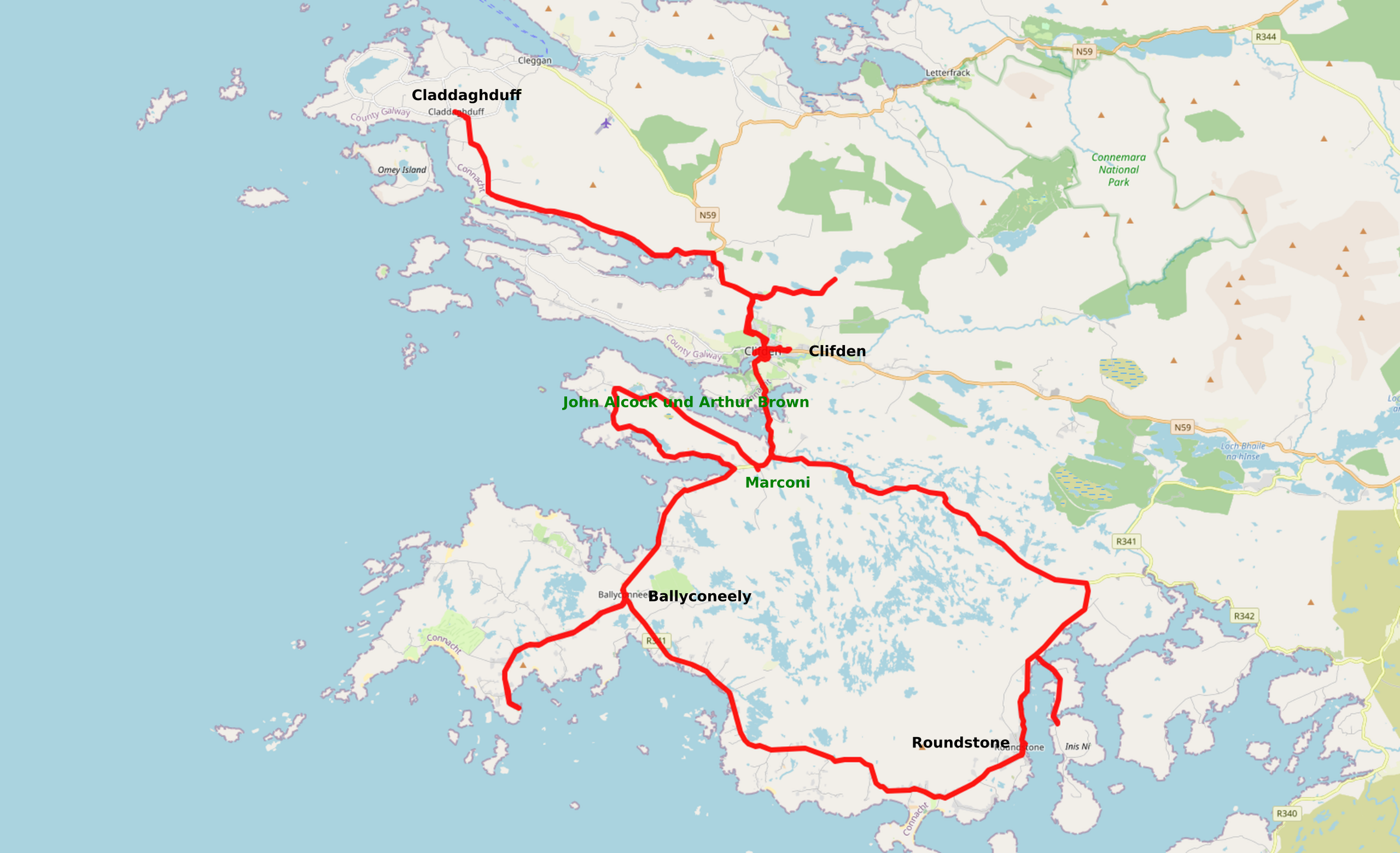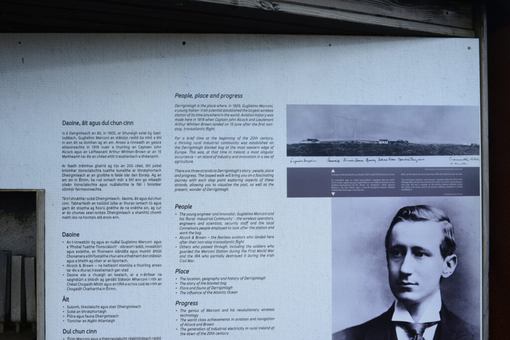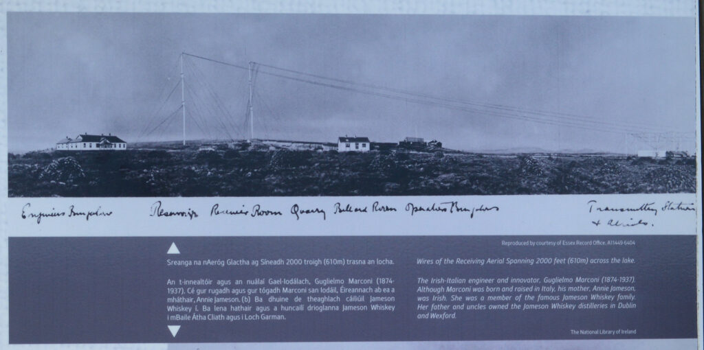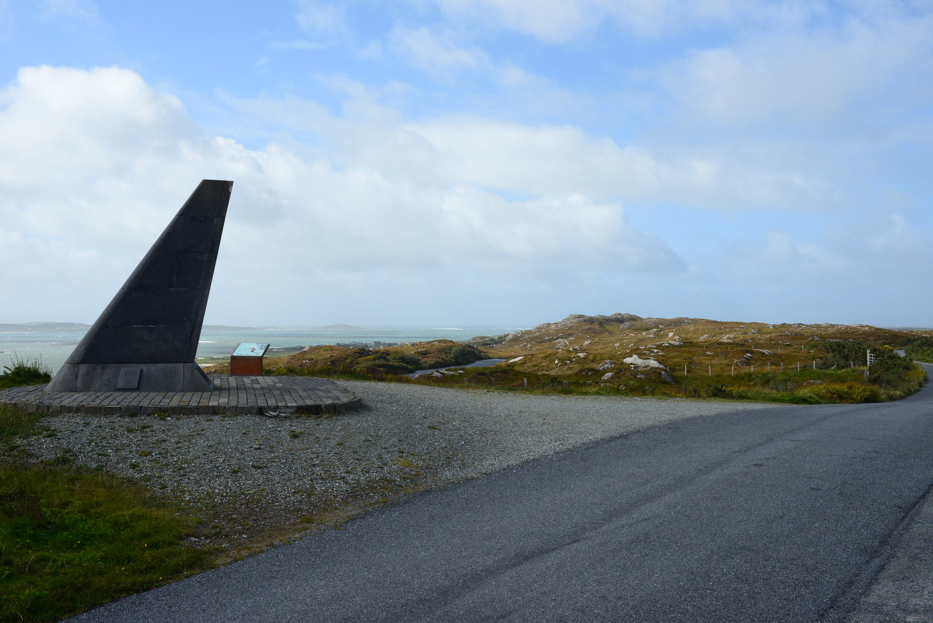 Kurz darauf biegen wir ab auf den Errislannan-Loop, eine weitere Halbinsel, die wir noch nicht kennen. Traumhaft! Steine, Mauern, wunderschöne Cottages, Pferde, Wasser in allen Grün- und Blautönen. Am höchsten Punkt ein Denkmal für John Alcock und Arthur Brown, die ersten Atlantiküberflieger, die hier gelandet sind – 1919. Nicht weit davon eine Infotafel zu Guglielmo Marconi, dem hier 1907 die erste Transatlantische Funkverbindung nach Neu-Schottland gelungen ist.