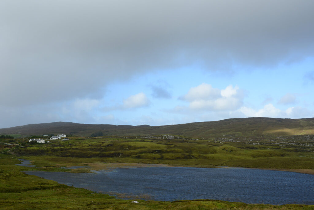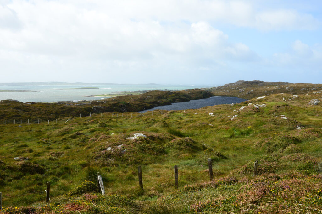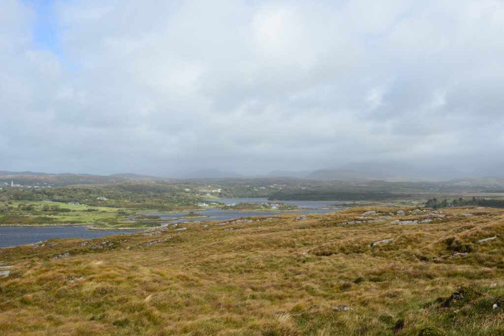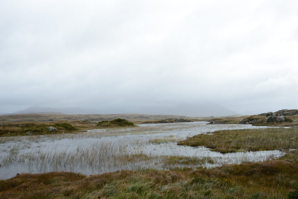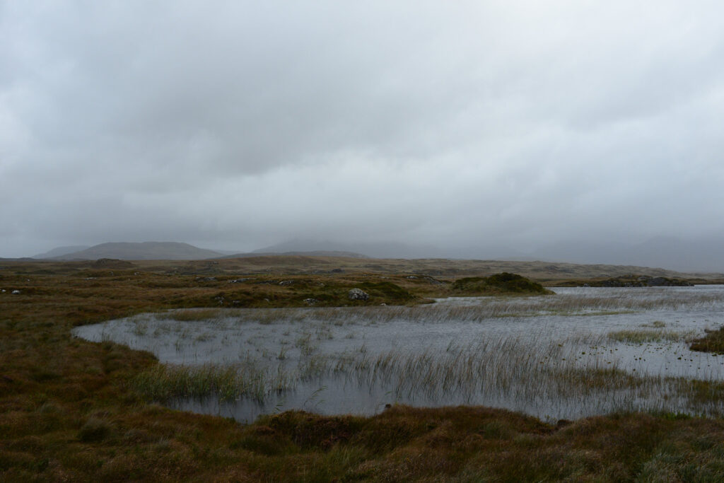 Hinter Clifden fahren wir zuerst über die Bog Road Richtung Osten. Ein Moor mit vielen Steinen, flachem Bewuchs, unendlich vielen Wasserlöchern und einigen Schafen. Heute mit grauem Himmel sehr passend.