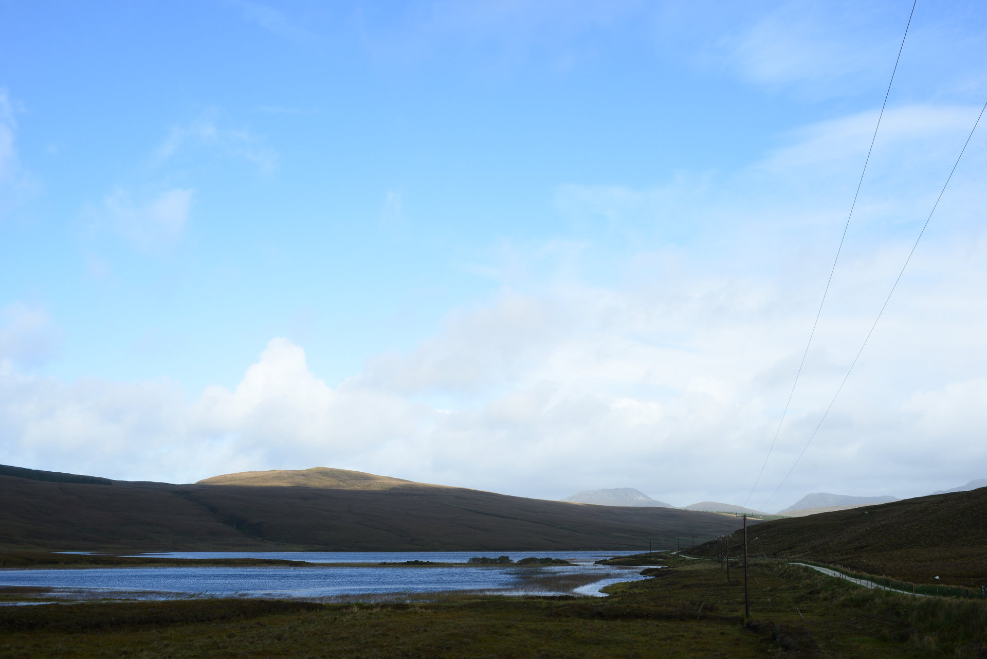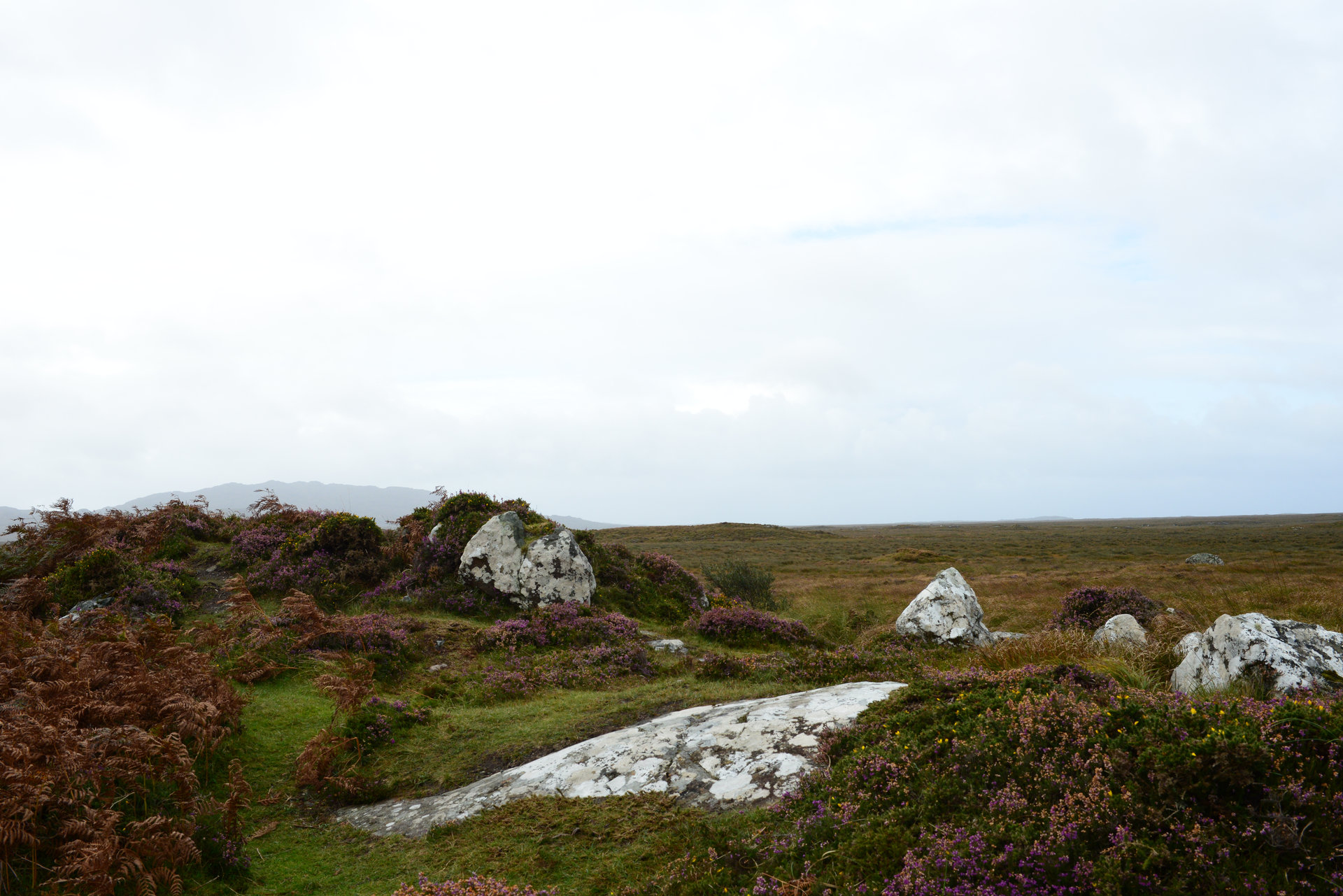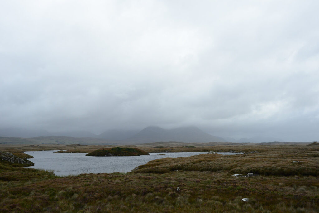 Hinter Clifden fahren wir zuerst über die Bog Road Richtung Osten. Ein Moor mit vielen Steinen, flachem Bewuchs, unendlich vielen Wasserlöchern und einigen Schafen. Heute mit grauem Himmel sehr passend.