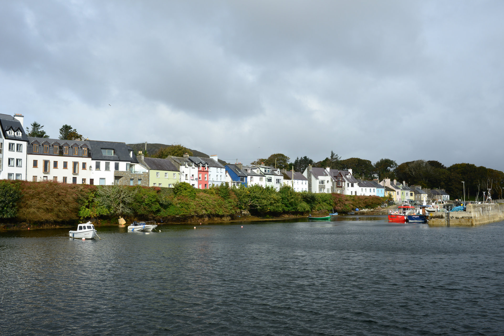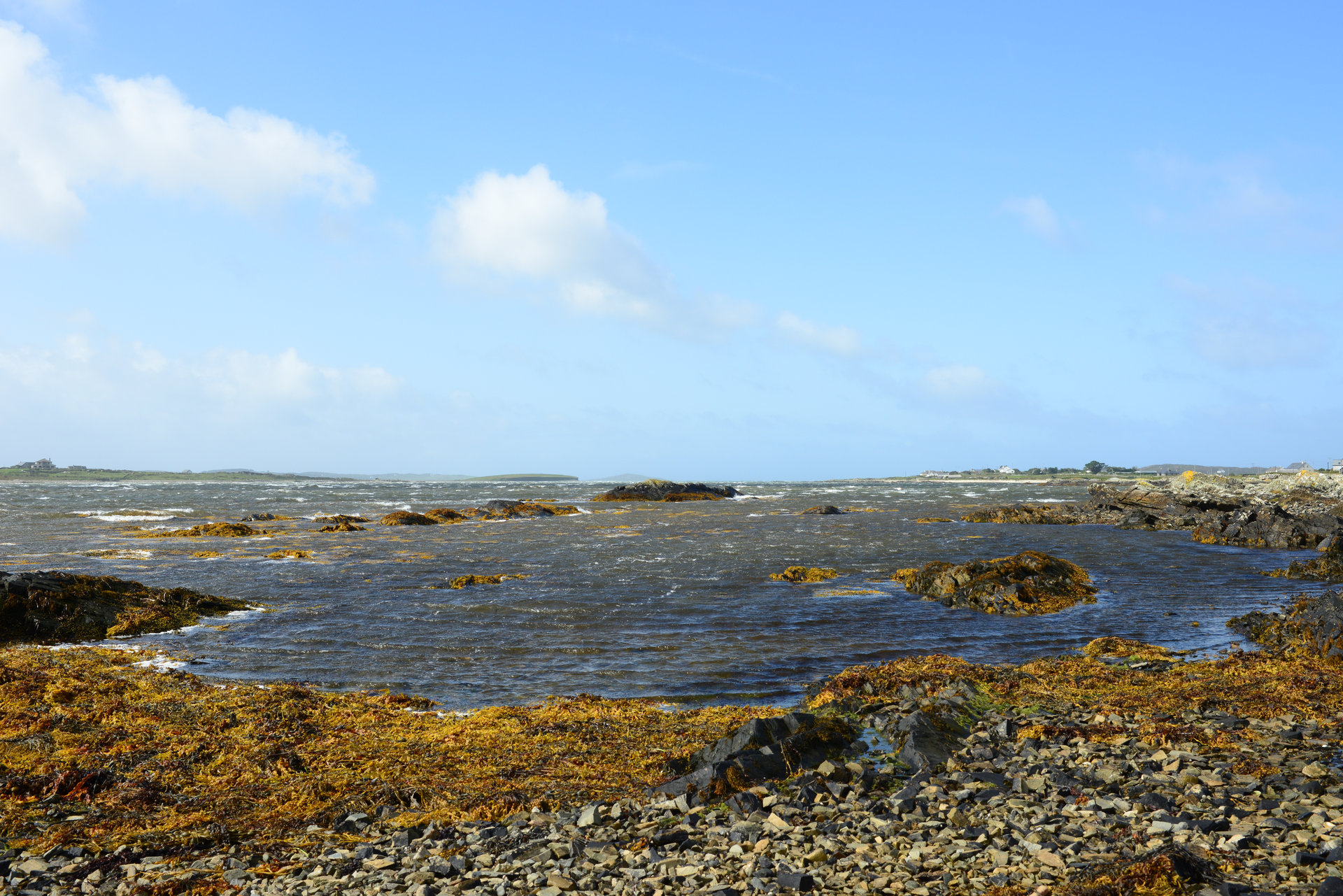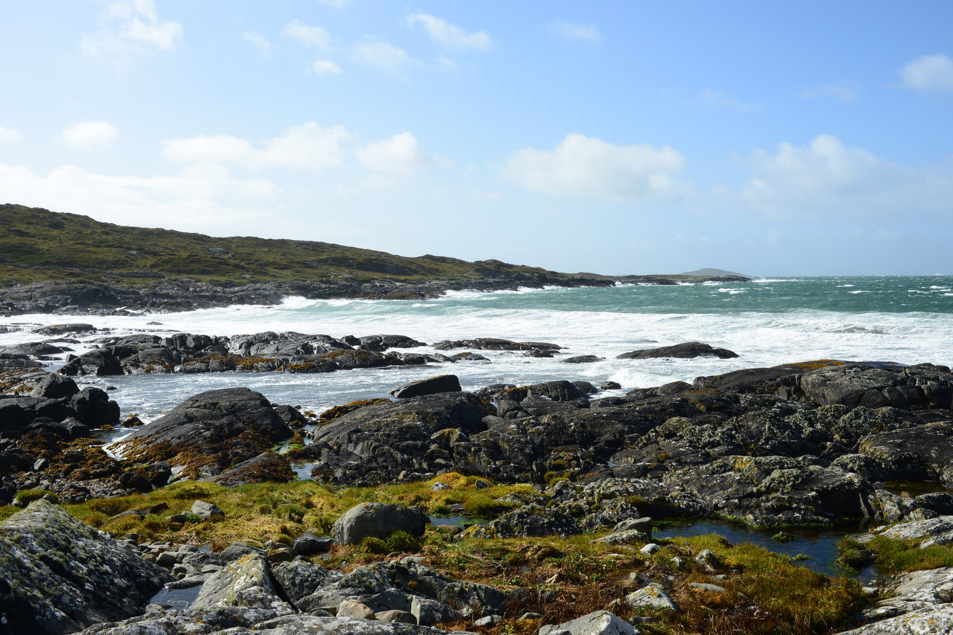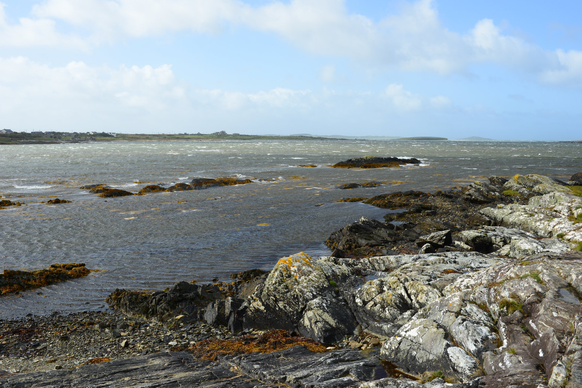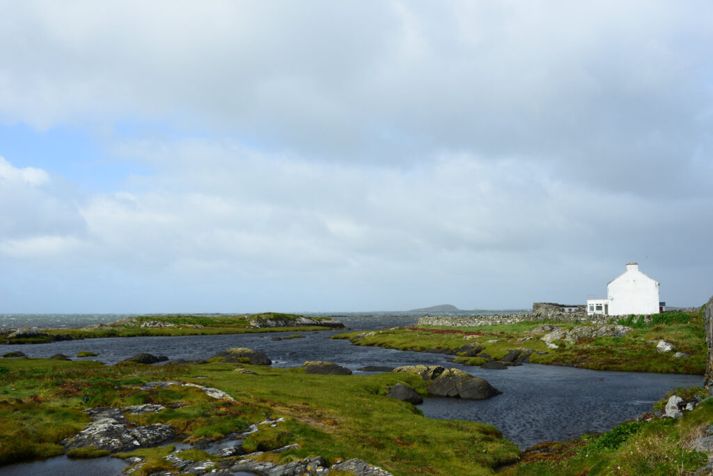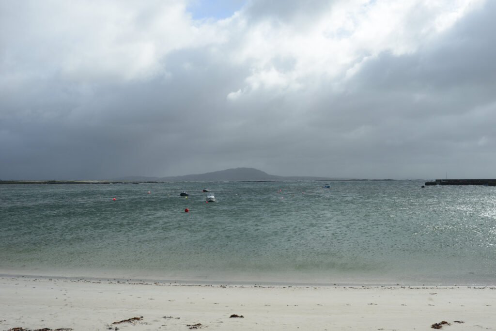 Nach einem kurzen Stopp in Roundstone, geht es weiter nach Ballyconneely für einen Café. Jetzt kommt ab und zu die Sonne raus, genauso schnell gibt es aber auch den ein oder anderen kurzen Schauer. Der Sturm ist so heftig, dass er uns bei allen Fotostopps von den Füßen reißt und das Fotografieren auch schwierig macht.