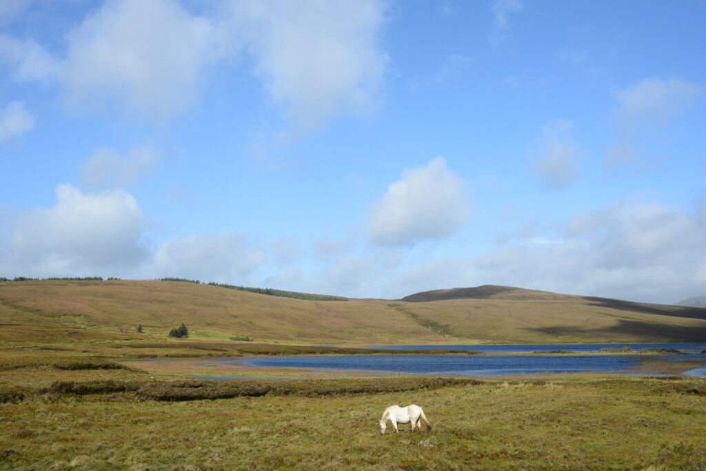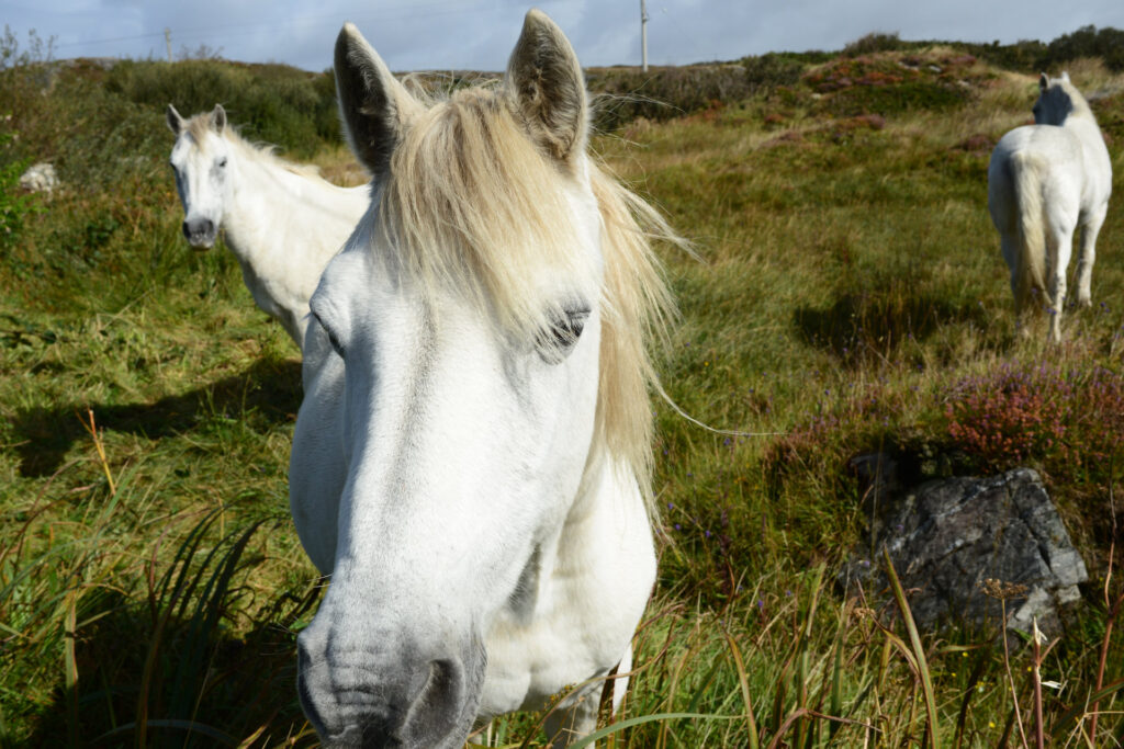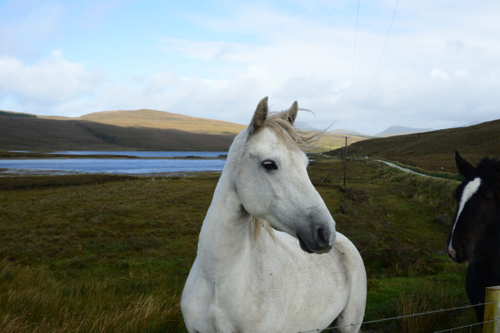 Bevor wir nach Hause fahren, tanken wir in Clifden, kaufen ein und dann machen wir noch einen Abstecher, der auf dem Heimweg ausgeschildert ist. Das Schild ist uns neu. Auf grottenschlechtem Sträßchen geht es 3km zum einsam gelegenen Lough Auna. Kurz warten wir auf die Sonne, die Pferde sind anscheinend darauf dressiert Vordergrund zu sein. Perfekt!