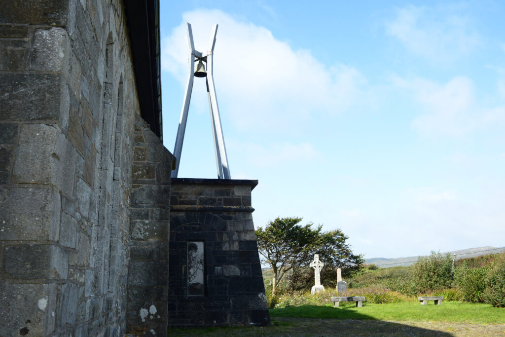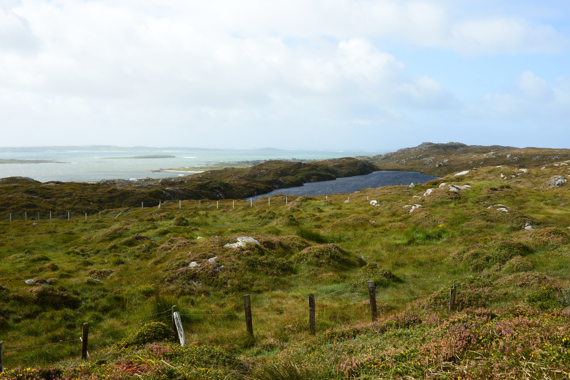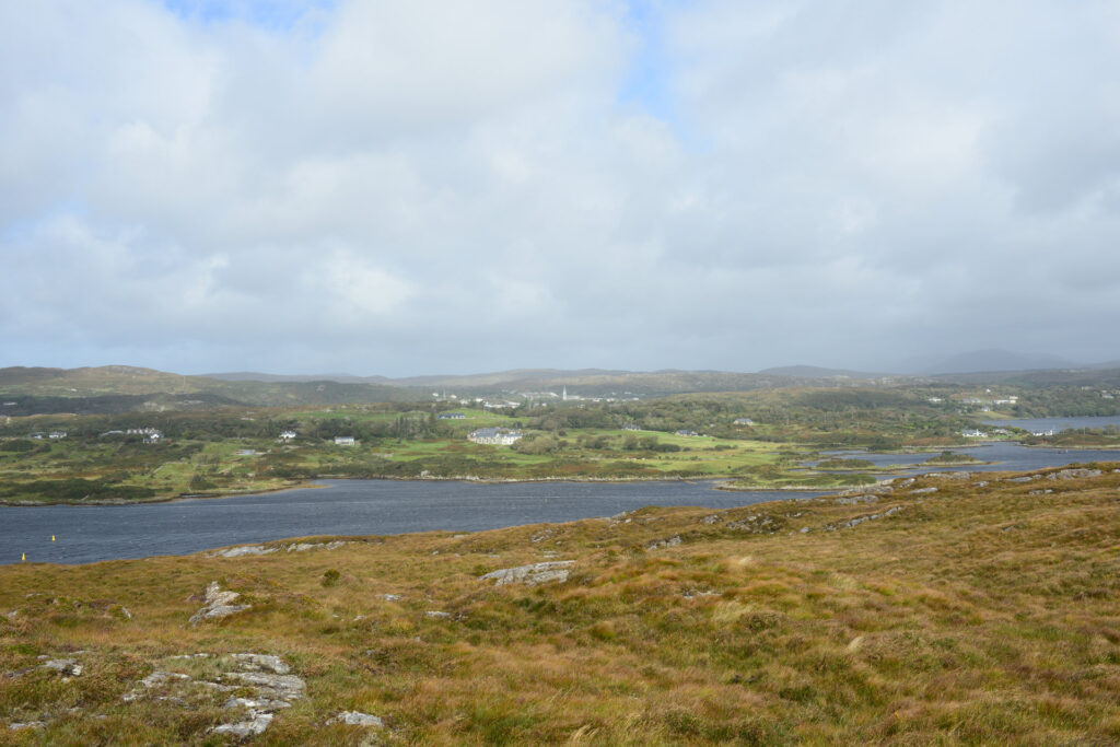 Kurz vor Roundstone biegen wir noch ab auf Inishnee, eine kleine Insel mit schmaler Strasse. Hier kommt uns ein alter Mann entgegen, sein Fahrrad schiebend und seinen Stock schräg am Lenker haltend, so dass wir zwingend anhalten müssen. Und natürlich geht es nicht ihn einfach vorbei zu lassen, das wäre extrem unhöflich. Also Fenster auf und smalltalk: Wetter, wo wohnen wir. Sehr mühselig, da er ein sooo hartes Englisch spricht. Wir verstehen 10%, der Rest ist Interpretation.