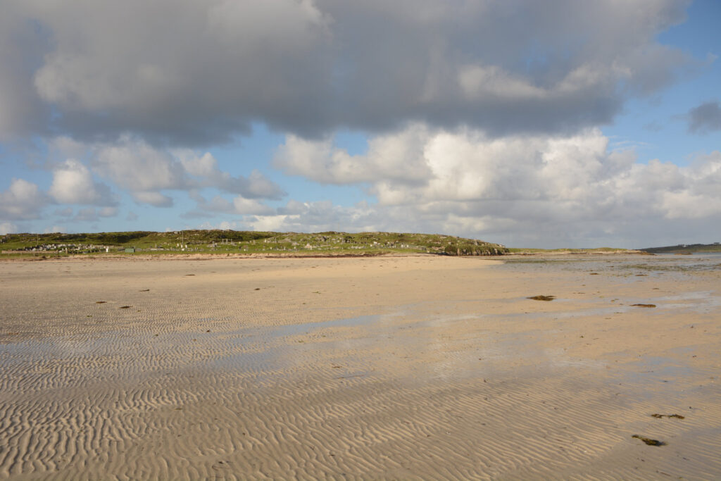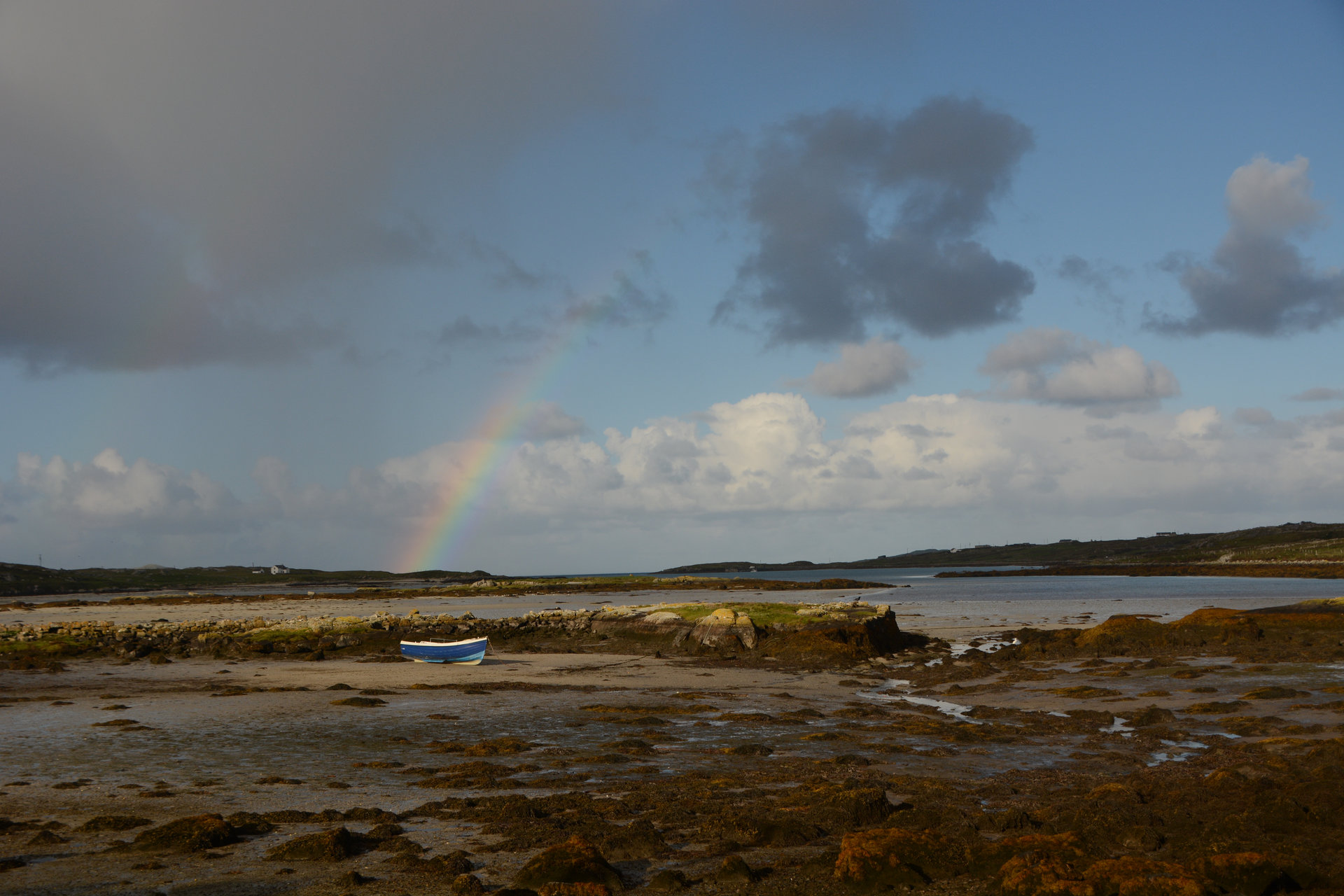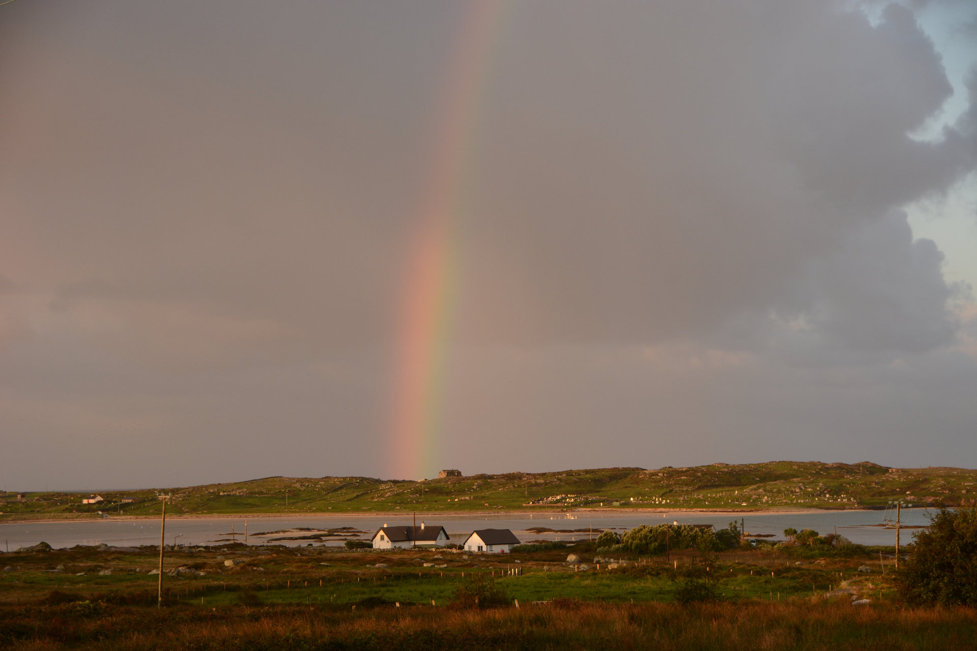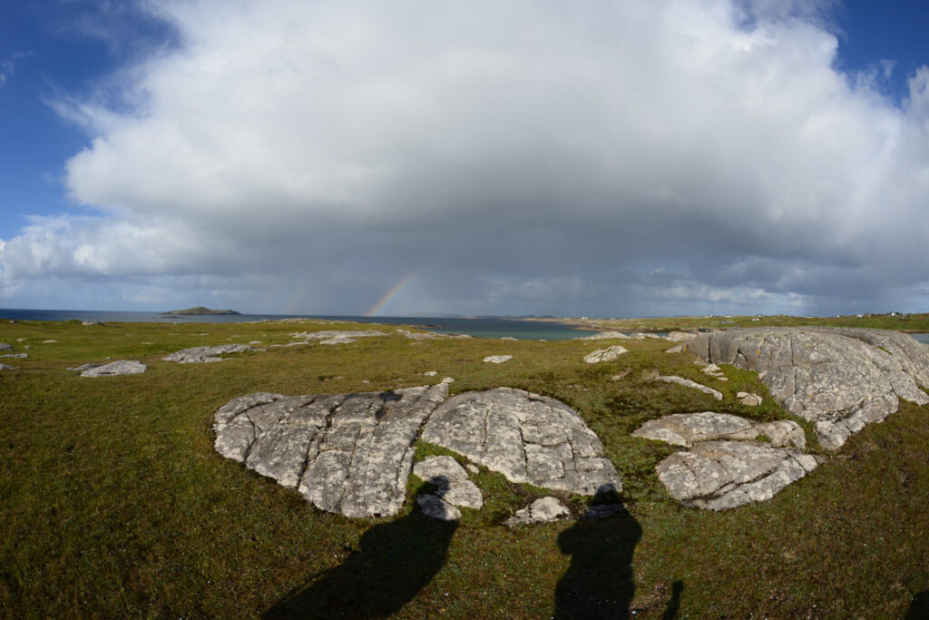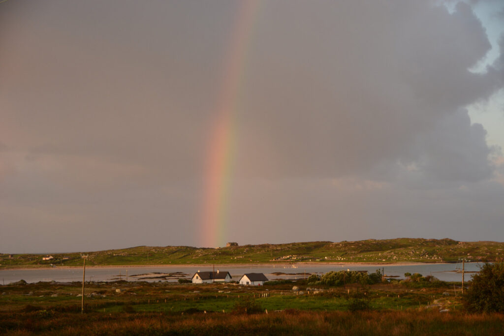 Wettervorhersage: kein Regen! Ebbe um 11:30, Flut um 17:50, d.h. 3 Stunden vorher ist der „Weg“ zu, also beste Voraussetzungen nochmal nach Omey Island zu laufen. Beim ersten Blick aus dem Fenster sehen wir einen Regenbogen (aber ohne Regen).