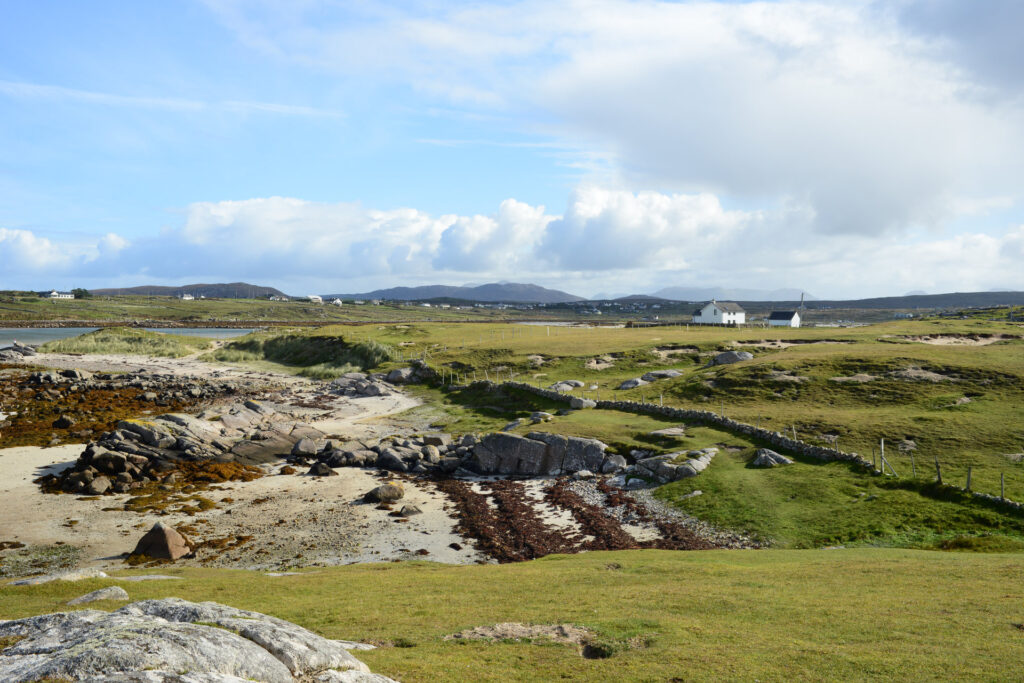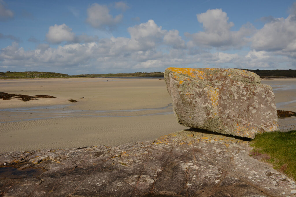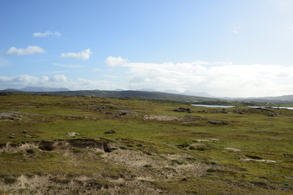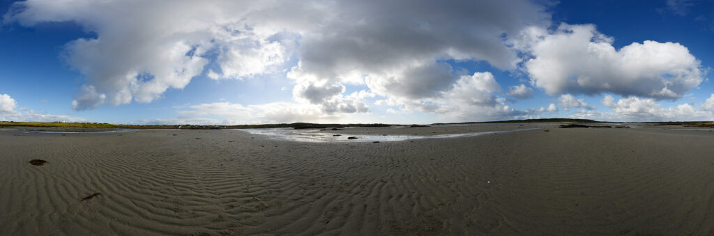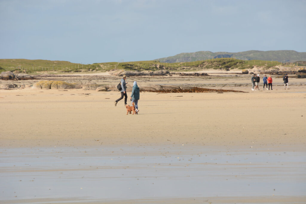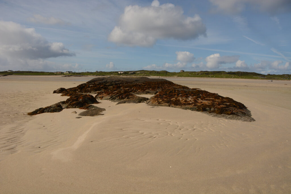 Wettervorhersage: kein Regen! Ebbe um 11:30, Flut um 17:50, d.h. 3 Stunden vorher ist der „Weg“ zu, also beste Voraussetzungen nochmal nach Omey Island zu laufen. Beim ersten Blick aus dem Fenster sehen wir einen Regenbogen (aber ohne Regen).