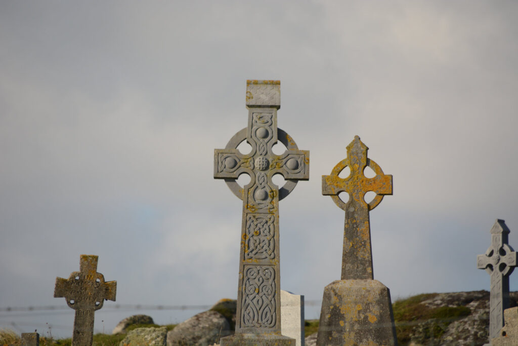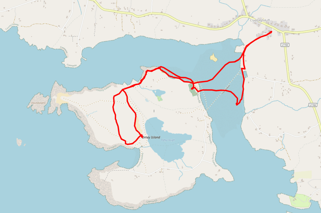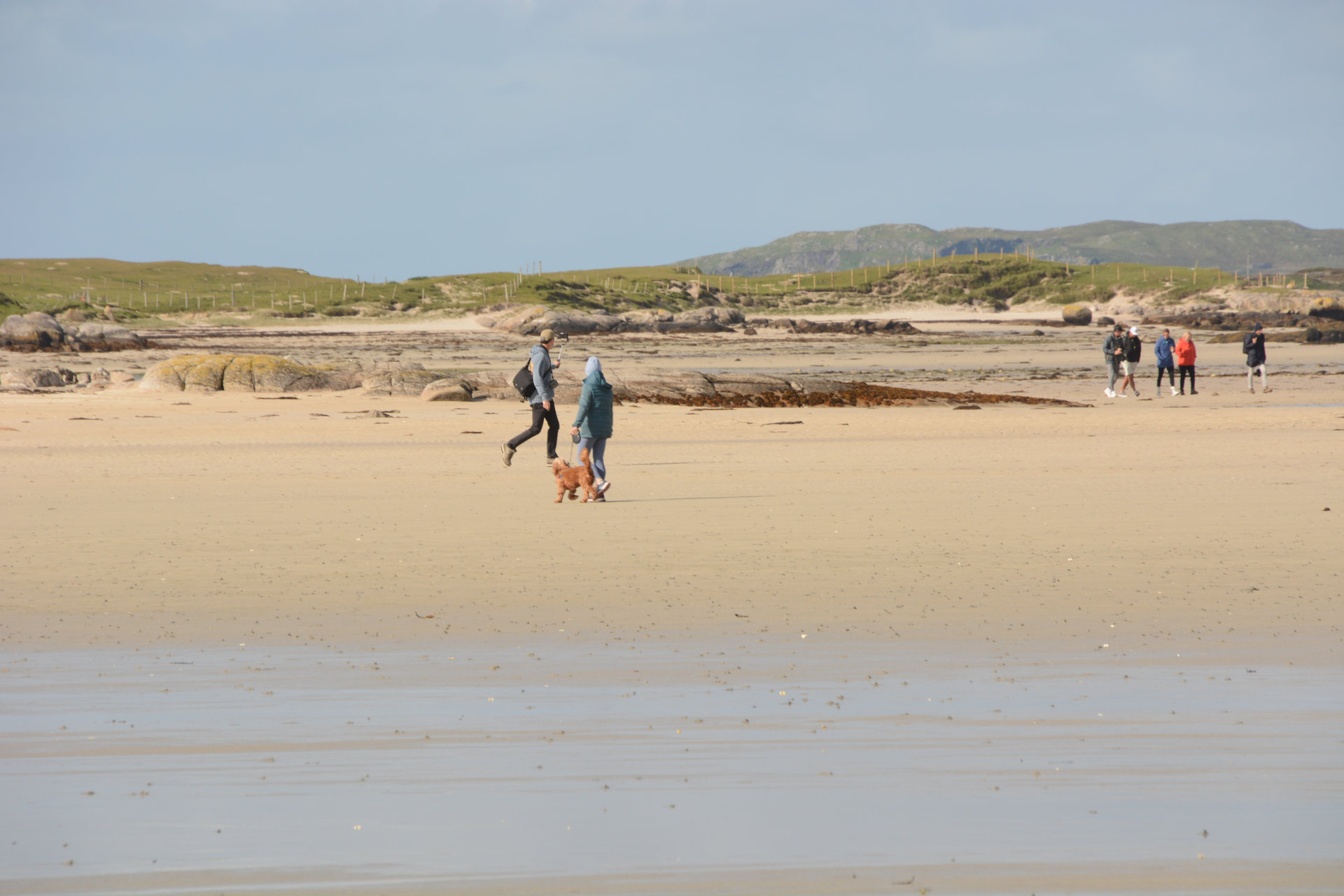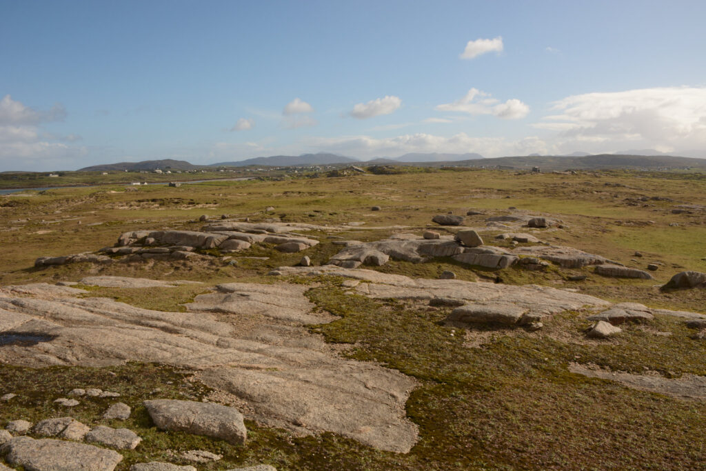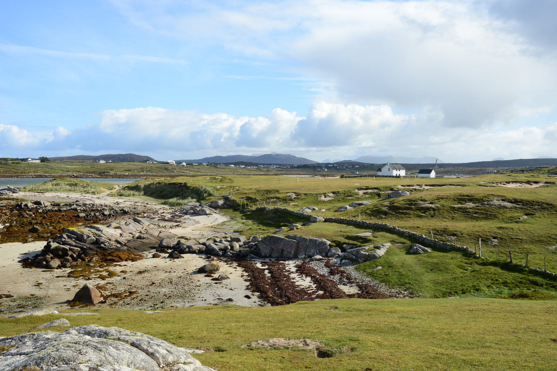 Wettervorhersage: kein Regen! Ebbe um 11:30, Flut um 17:50, d.h. 3 Stunden vorher ist der „Weg“ zu, also beste Voraussetzungen nochmal nach Omey Island zu laufen. Beim ersten Blick aus dem Fenster sehen wir einen Regenbogen (aber ohne Regen).
