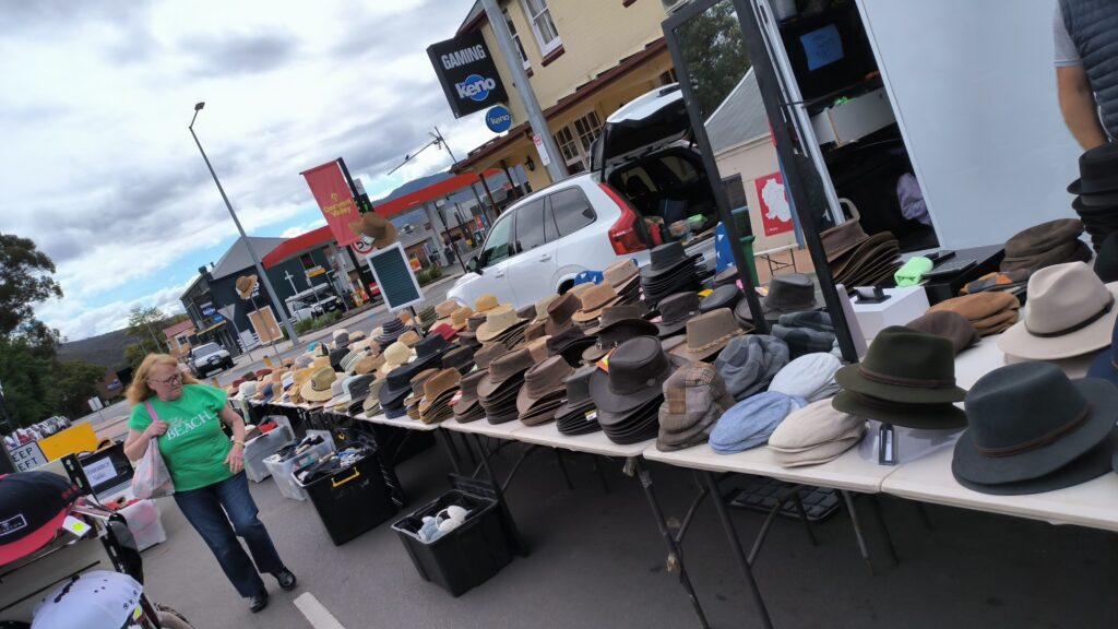 In New Norfolk wollen wir unsere Vorräte auffüllen. Was wir nicht wissen ist, daß Markttag ist. Super! Also kaufen wir erst im Supermarkt ein und gehen dann über den Markt. Es ist ein Flohmarkt, Gemüsemarkt, Obstmarkt, Markt für Selbstgemachtes und auch Händler die ihre Waren nicht in den Geschäften ringsum anbieten. Echt sehr schön. Wir sind ja auch hergekommen um in die 2 Geschäfte zu gehen, die beim letzten Mal geschlossen waren. Das machen wir natürlich und ärgern uns, daß wir nichts mitnehmen können. Ein Shop hat ausgefallene Gegenstände für den Haushalt und der andere Alles was mit Schreiben und Papier zu tun hat. Ich muß Elke aus beiden Läden rausschubsen.
