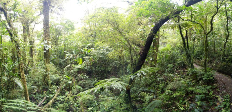 Es erwartet uns ein unvorstellbar schöner Wald. Tolle Bäume die über und über mit Bromelien, Farnen und weiss der Teufel was bewachsen sind. Wir wissen gar nicht wo wir zuerst hinsehen sollen. Leider ist es stockdunkel. Die Kamera ist auf die höchste Empfindlichkeit gestellt und trotzdem verwackeln wir viele Bilder. Der Wald ist undurchdringlich und nur über die angelegten Pfade zu laufen. An einer Kreuzug sieht jemand eine Vogelspinne mit orangfarbenen Kniescheiben. Hie und da sehen wir Tausendfüssler in gelb-schwarz. Es soll hier noch viele andere Tier geben, aber bei dem Trubel verziehen die sich natürlich. Wir sind auf etwa 1700m. Wir haben so etwa 20° und die Luftfeuchtigkeit ist bestimmt 100%. Wir kommen trotz Lichtmangel aus dem Fotografieren nicht mehr raus. Nach etwa 3 Stunden sind wir wieder am Eingang und gönnen uns ein Empanada und eine Limo.