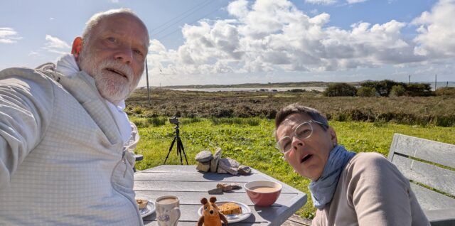 Der Blick aus dem Fenster heute morgen ist wenig erbaulich. Alles grau in grau! Das war zwar so gemeldet, aber seit wann wissen DIE wie das Wetter wird? Beim Frühstück sehen wir wie der Wind die feuchte Luft waagrecht durch die Landschaft treibt. Trotzdem wollen wir uns ein wenig bewegen. Zweimal versuchen wir es. Jedesmal wenn wir die Tür aufmachen regnet es wieder. Beim 3. Mal ist es so gut wie trocken und wir laufen los. Nach einem Kilometer fängt es an zu regnen und wir sind in kürzester Zeit nass. Wir laufen zurück, wechseln die Hosen, ziehen diesmal (Thomas widerwillig!) Regenhosen an Grauer Nebeltag weiterlesen