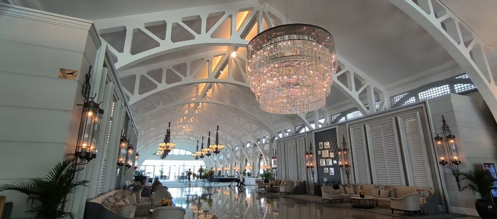 Wir kommen am Fullerton Bay Hotel vorbei. Ziemlich vornehmer Schuppen, aber mit einem Public Access! Am Empfang kommt direkt ein Angestellter in Livrée auf mich zu. Da wir nirgendwo Briefmarken finden können frage ich ihn höflich danach. Er fragt wie viel ich gerne hätte und verkauft mir eine. Na das ist mal nett!