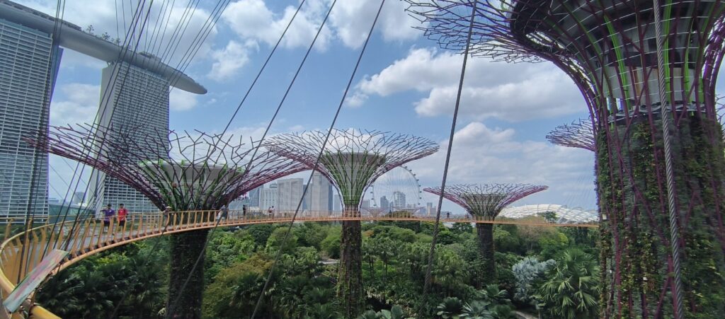Nun laufen wir durch Gardens by the Bay Ein riesiges Gebiet mit tollen Pflanzen. Für 14S$ leisten wir uns auch noch den Skyway. Zwischen den Supertrees ist eine Hängebrücke gespannt auf der man eine schöne Aussicht hat.