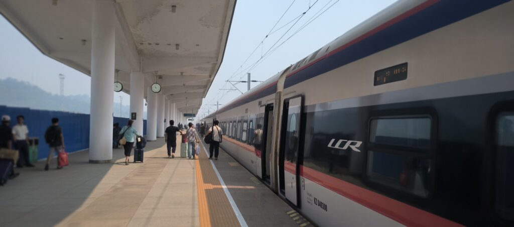 Nach einer letzten Nudelsuppe fahren wir mit einem TukTuk der chinesischen Marke Wuling zum Bahnhof. Der Tacho geht bis 200, aber die 50 km/h erreichen wir nie, obwohl der Straßenzustand es durchaus zuliesse.